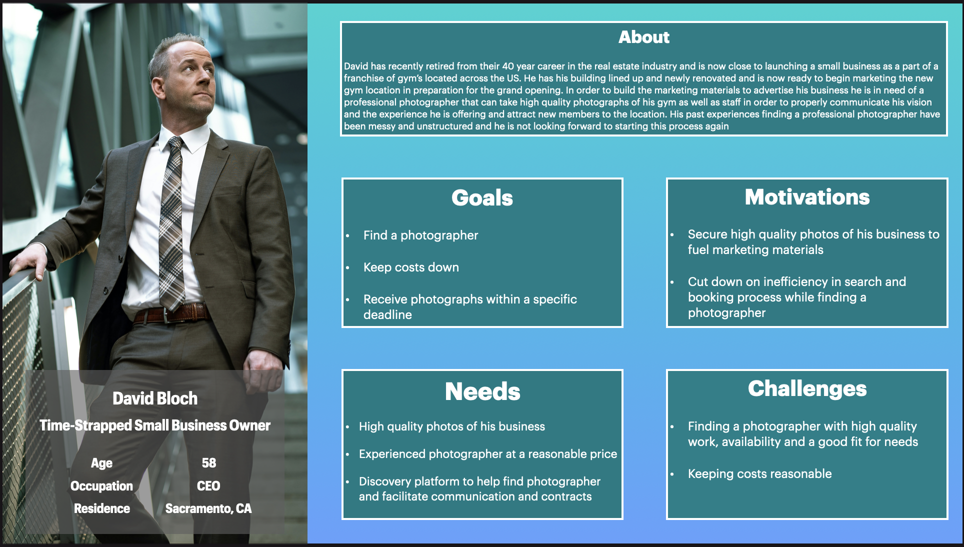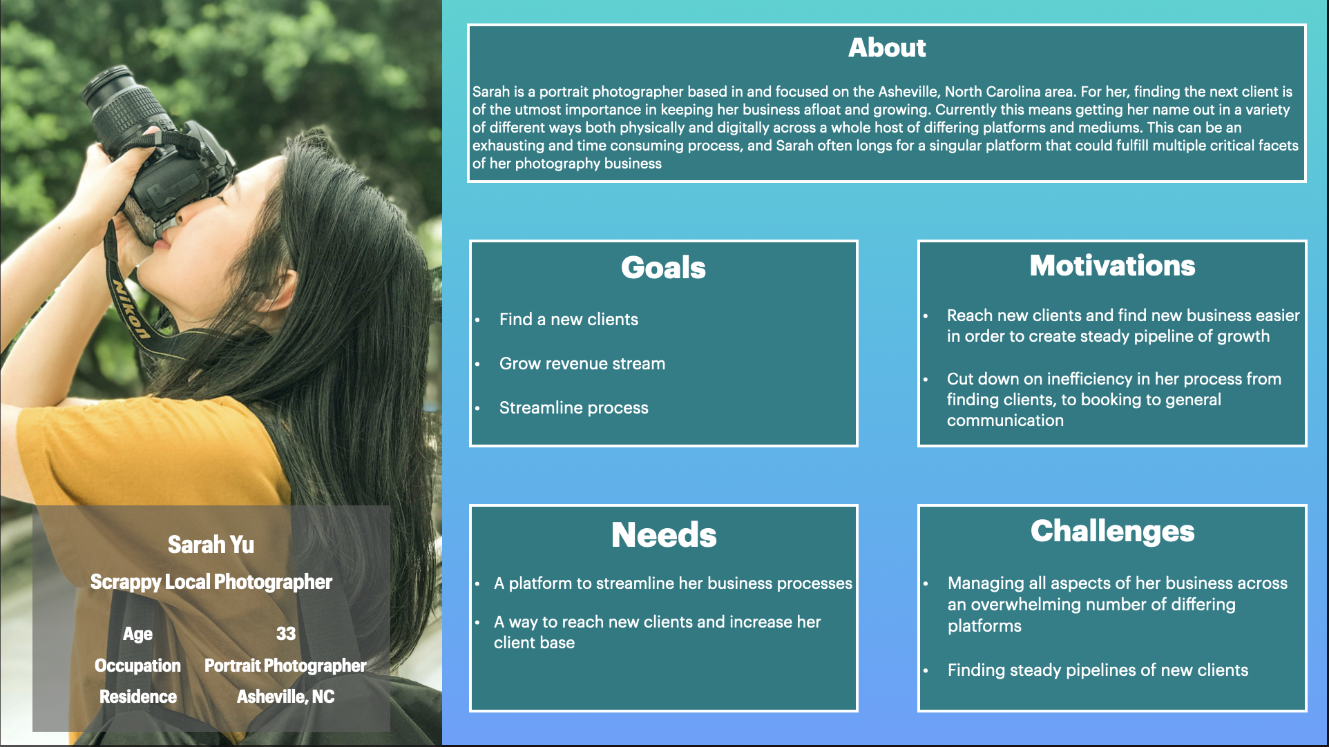 With the research completed and data points collected, I was able to identify the major problem areas and begin to ideate how to solve these issues for both user groups. To encapsulate the two different sets of users that would leverage the platform, I created two distinct personas representative of each: the “scrappy local photographer” and the “time-strapped small business owner”. Keeping these two groups in mind, I would then move my focus to starting to build out solutions.