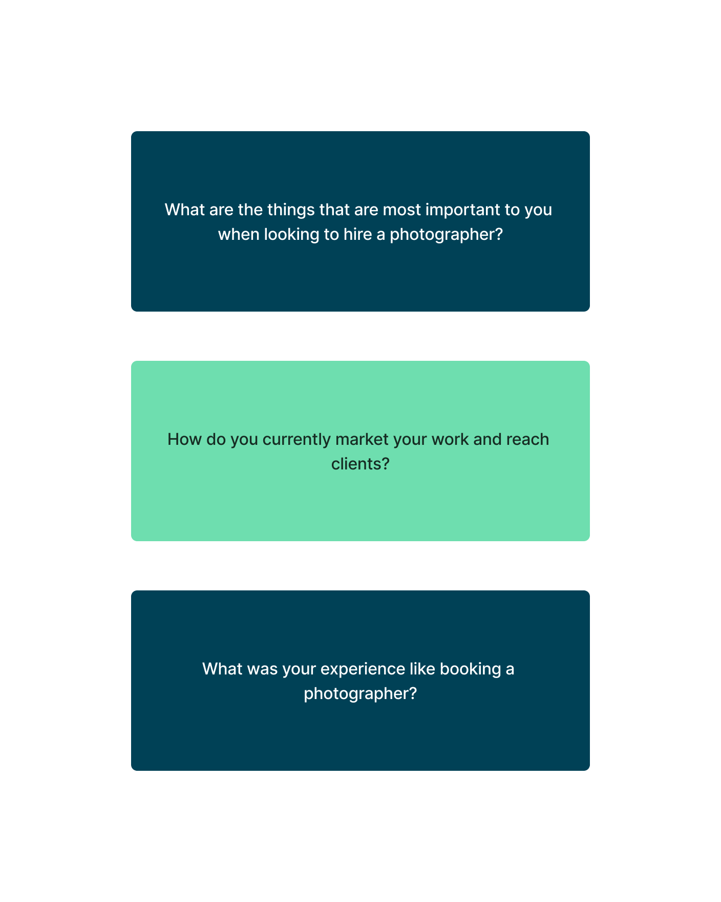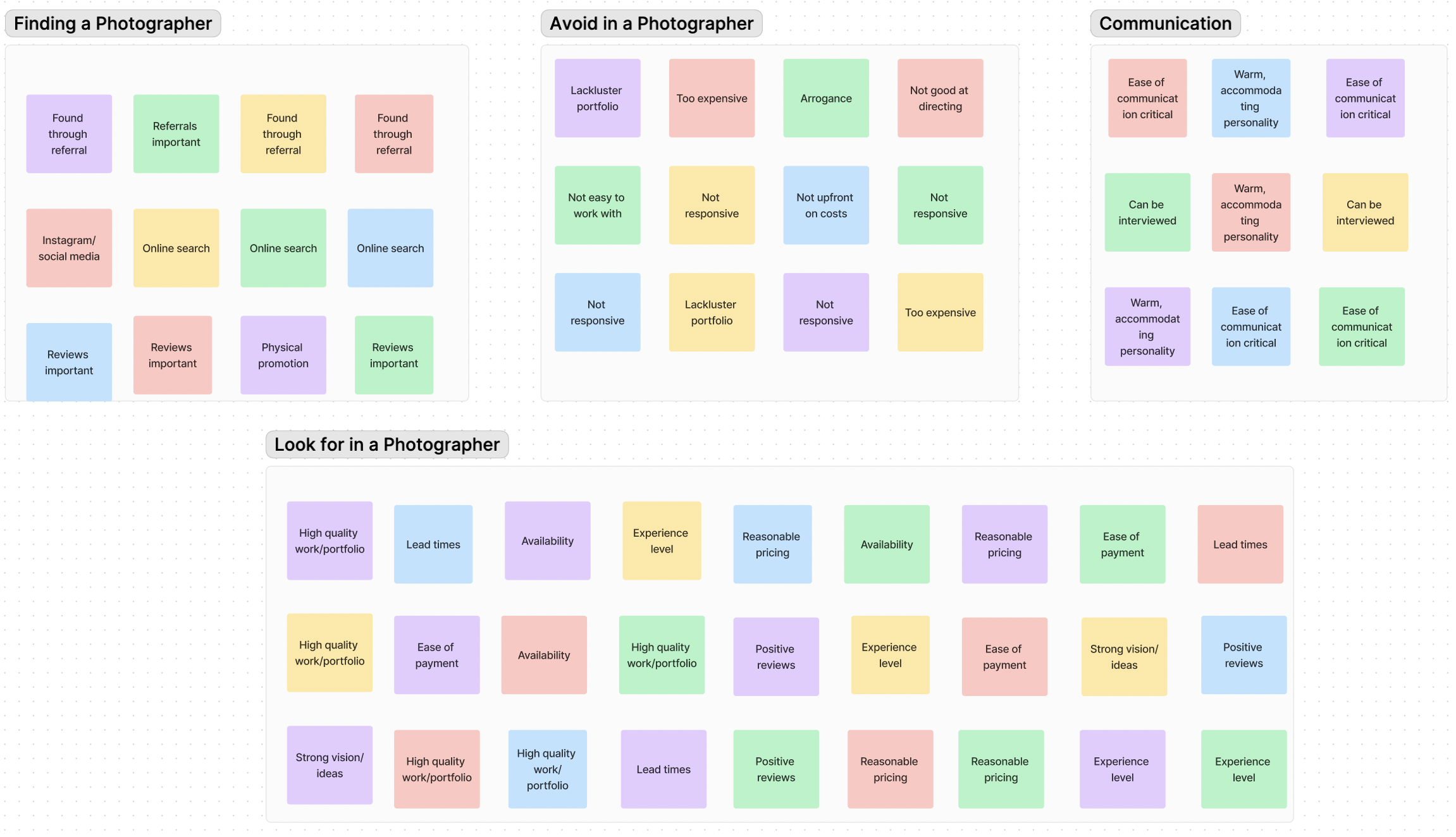 My goal with the research process was to understand how users currently went about the process of finding and booking photographers, and what where the major areas of friction were and what they hoped could be improved.