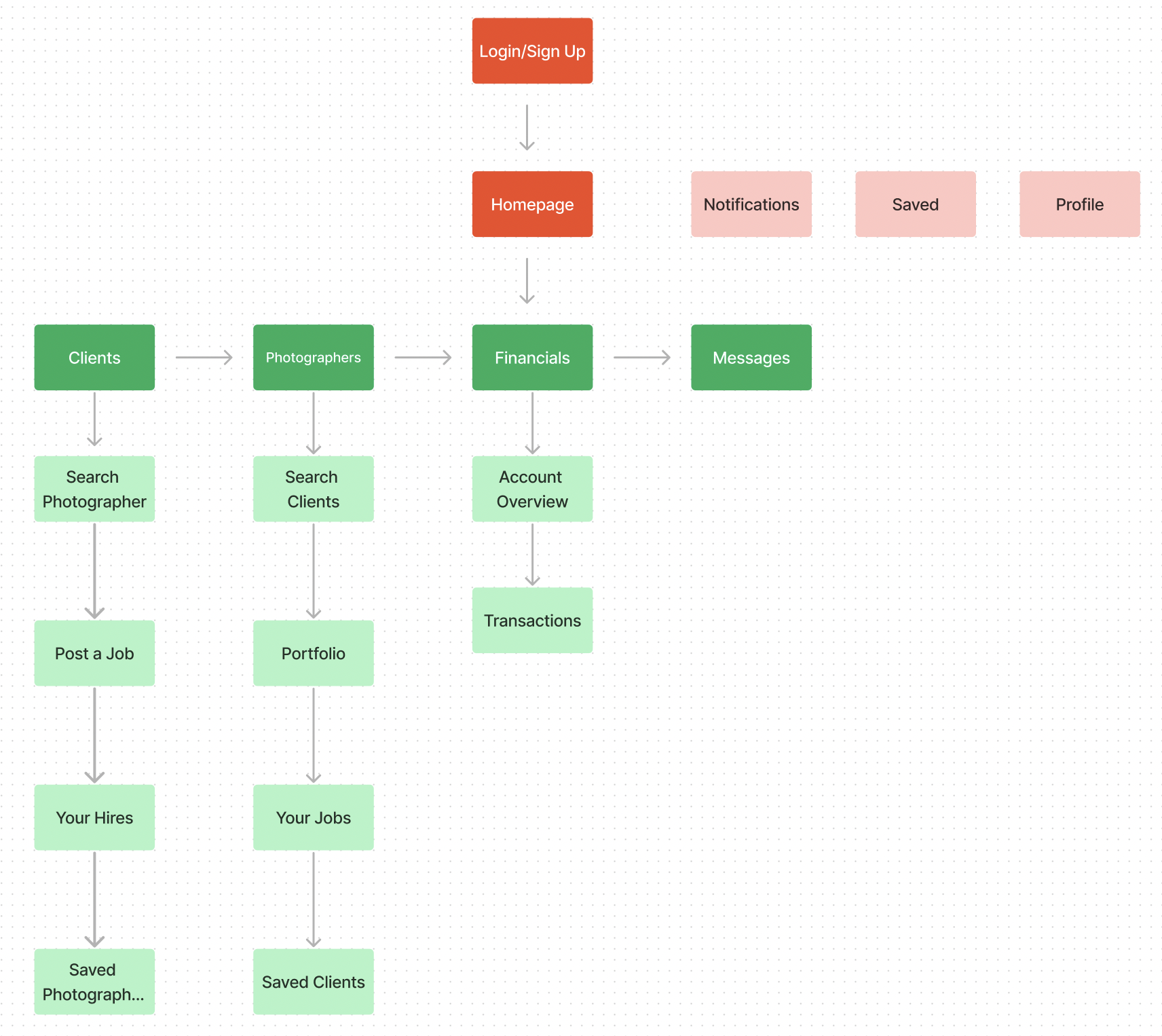 With my site map now in place, I then worked towards building out key user flows for Image Connect. I focused on the user creating their account as well as going through the process of searching for and booking a photographer.