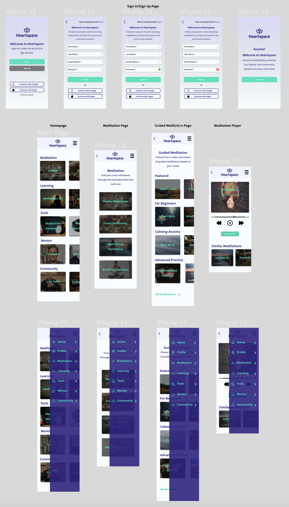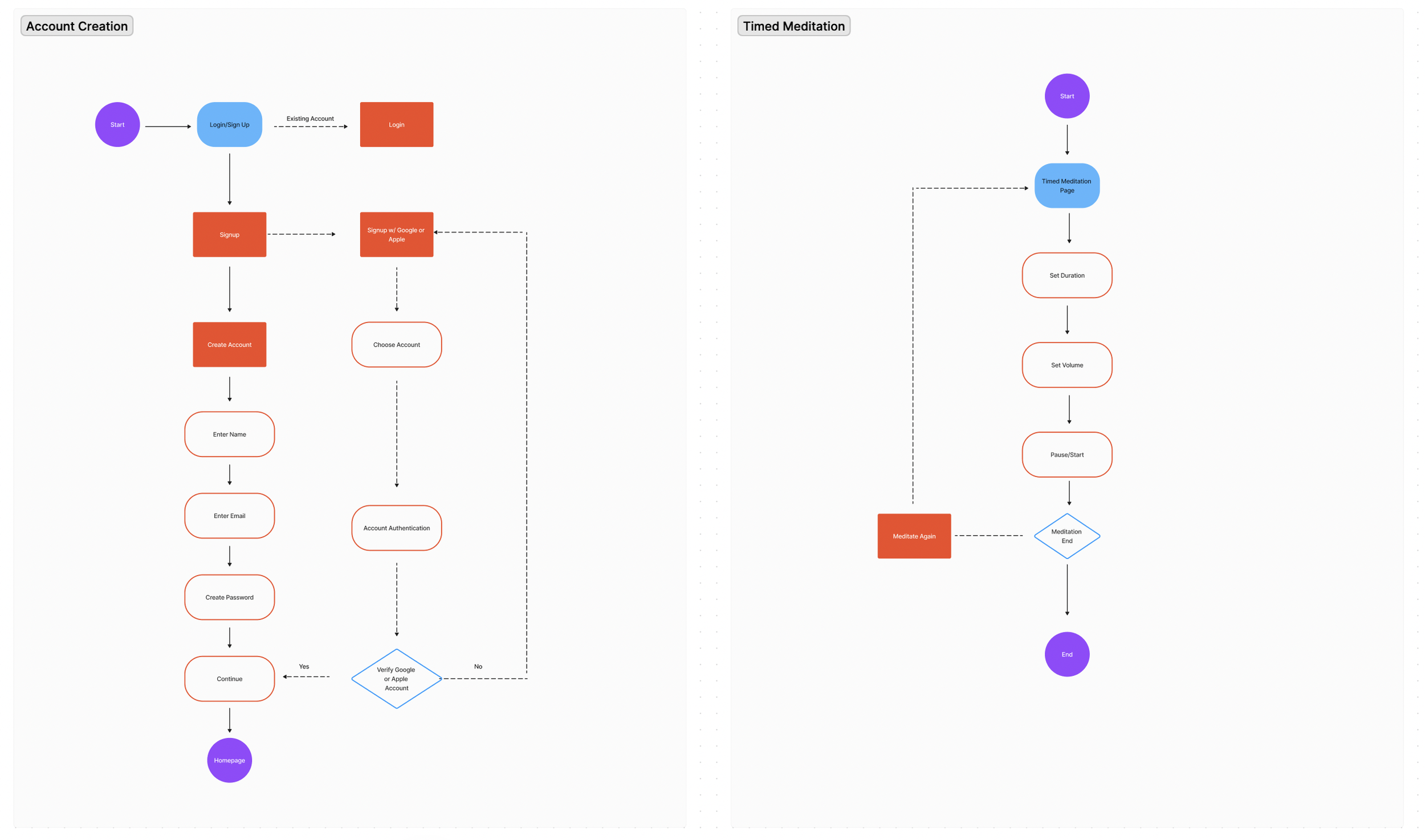 With my site map now in place, I then worked towards building out key user flows for Heartspace. I focused on the user creating their account as well as starting a timed meditation session.