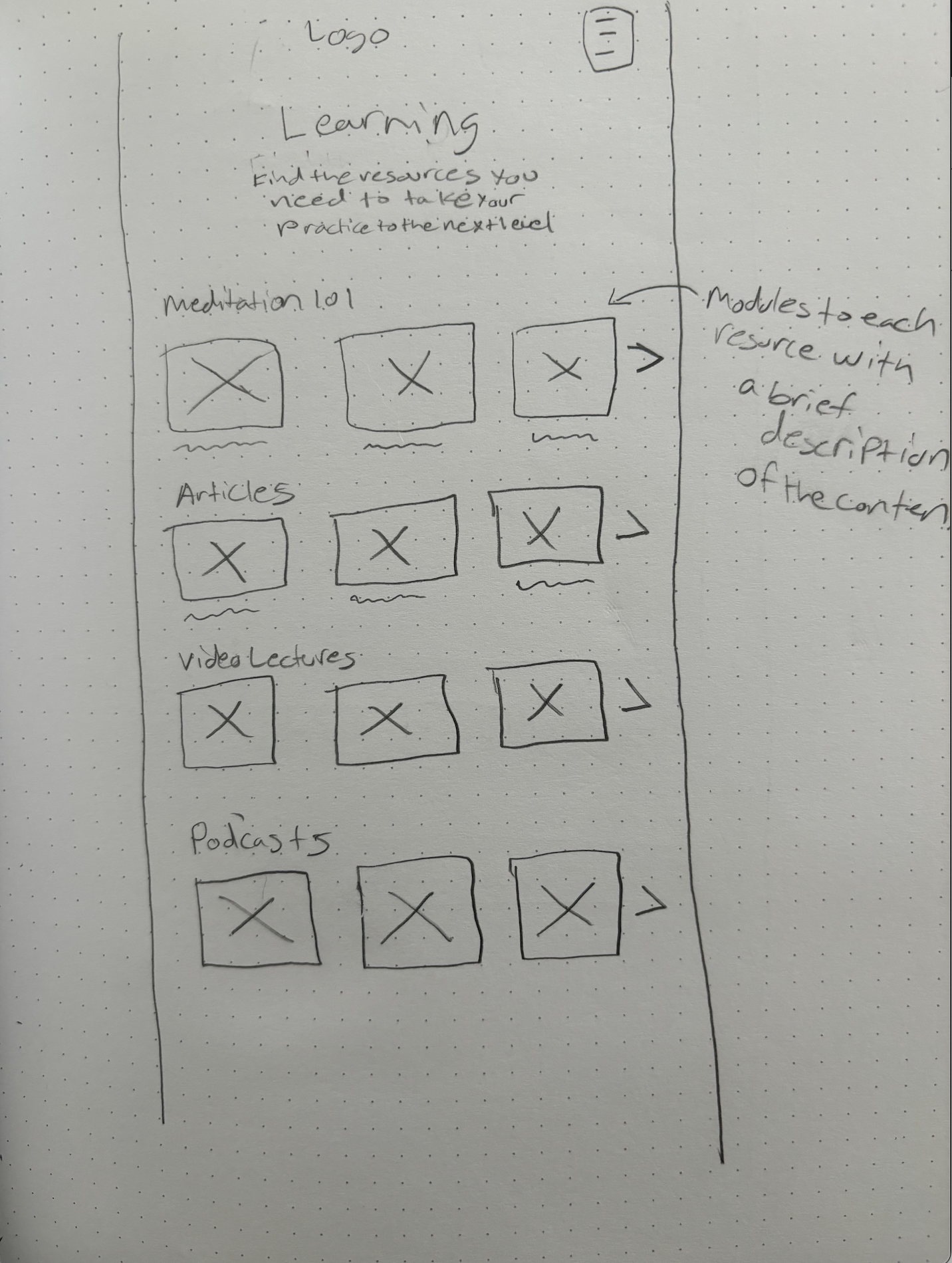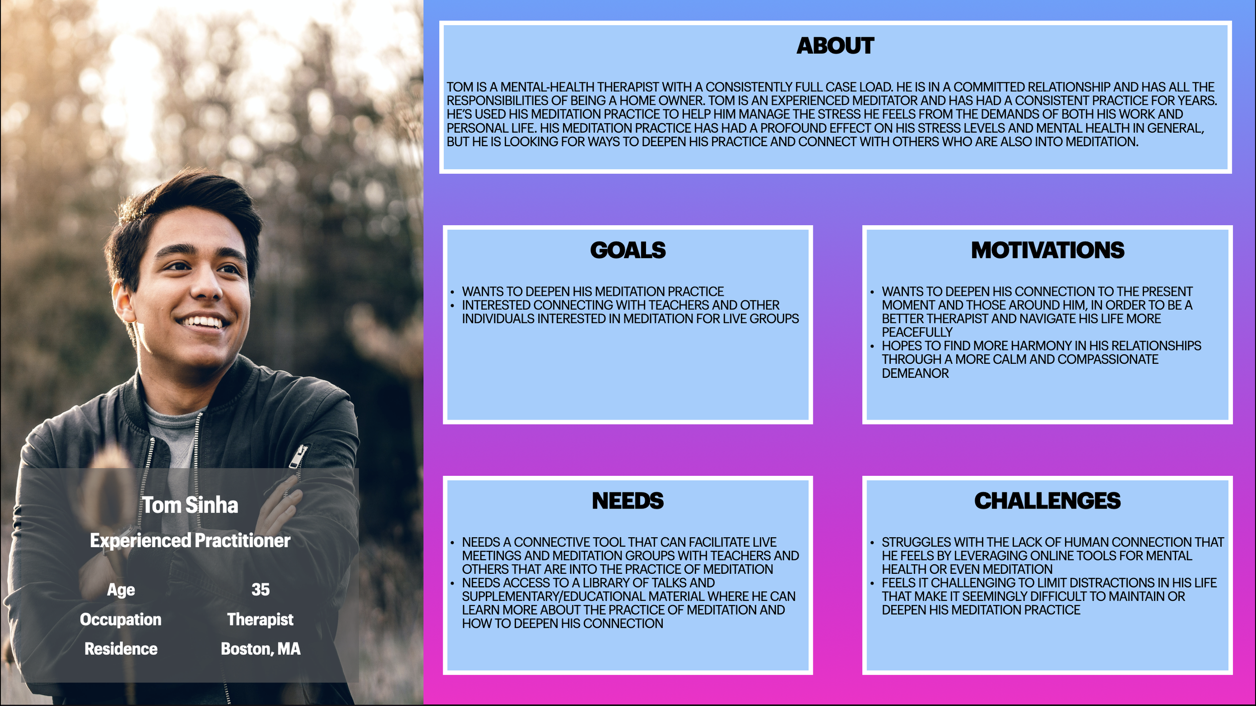 After completing both primary and secondary research I identified many common points of friction for users as well as aspirational features and services shared by the participant group. It was clear that both experienced and inexperienced meditators were interested in building community, having access to teachers and leveraging instructional information to help them understand and deepen their practice.
