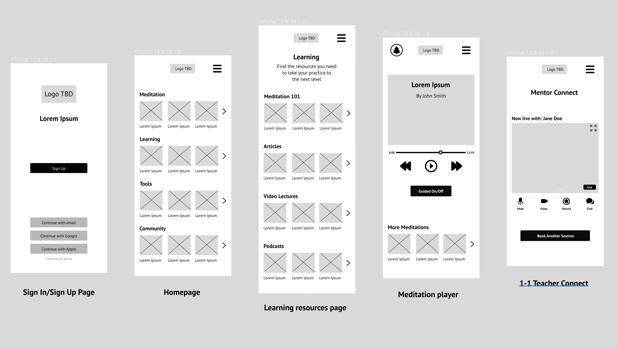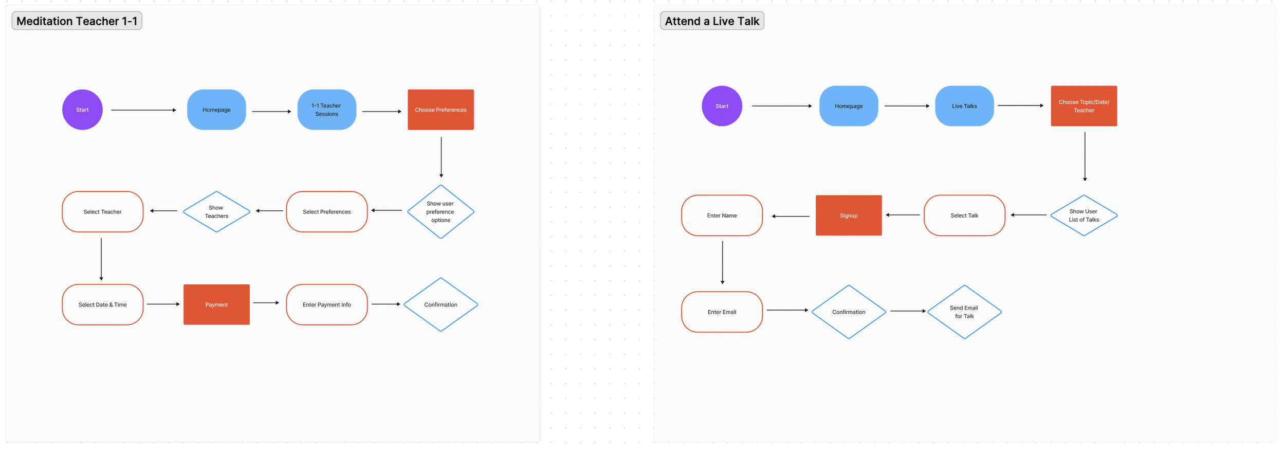 With key user flows in place I then focused on a few task flows within the service. The initial focus was on setting up a 1-1 with a meditation teacher, and attending a live group talk.